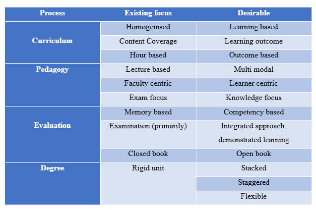 The whole paradigm of higher education needs a revamp in mindset, attitude and outcomes, what we need to be attempting in this system could be related to changes in Curriculum, Pedagogy and Evaluation methods based on the learner, and more distributed.
